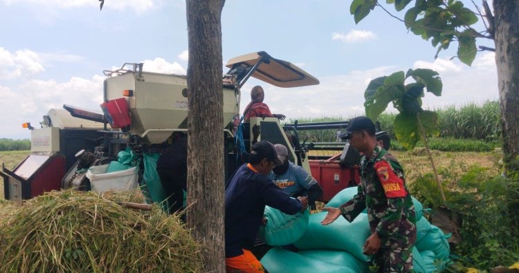 Babinsa Desa Lemahbang  Koramil 0804/13 Bendo Dampingi Petani Panen Padi Gunakan Alat Modern Combine Harvester