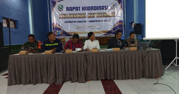Magetan. - Babinsa Kelurahan Kepolorejo Koramil Tipe B 0804/01 Kodim 0804 Magetan Sertu Irvan menghadiri pelaksanaan kegiatan rapat kordinasi kelurahan Kepolorejo bertempat di balai pertemuan Kelurahan Kepolorejo Kecamatan Magetan Kabupaten Magetan. Rabu (28/01/26)