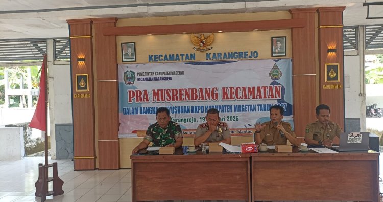 Magetan. - Pemerintah Kecamatan Karangrejo bersama beberapa jajaran Forkopimcam, Hadir Camat Karangrejo Secondany Budi W.S.Sos. M.M, Danramil Karangrejo Kapten Inf Kiswanto SE Kapolsek Karangrejo AKP Hari Joko Prayitno S.H. dan 12 Kepala Desa se-Kecamatan Karangrejo melaksanakan Pra Musrenbang Kecamatan Karangrejo di pendopo Kecamatan Karangrejo. Pra Musrenbang dilaksanakan dalam rangka Penyusunan RKPD Pemerintah Kecamatan Karangrejo Tahun 2026. Pra Musrenbang Tingkat Kecamatan Karangrejo sebagai upaya tindak lanjut dari hasil musrenbang tingkat Desa yang telah disepakati, kemudian dipilih satu usulan prioritas program dari 12 Desa masing-masing kemudian diusulkan dalam kegiatan Pra Musrenbang Tingkat Kecamatan Selasa ( 20/01/26 ).