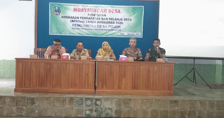 Kegiatan musdes penetapan apbdes tahun 2026 pemerintahan desa pojok di hadiri camat kawedanan ibu ari budi astuti s.stp m.si, komandan koramil tipe b 0804/10 kawedanan kapten inf reza muhsin su, kapolsek kawedanan akp joko yuono sh, kepala desa pojok bpk dedi sumedi, ketua bpd bpk tukimun, babinsa desa pojok sertu waloyo, babinkamtibmas desa pojok bripka deni, perangkat desa pojok, tamu undangan 30 orang.