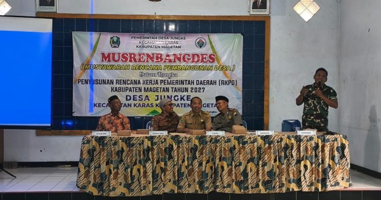 Magetan. – Danramil 0804/07 Karangrejo Kapten Inf. Kiswanto S.E menghadiri kegiatan Musrenbangdes perubahan RPJMDes Tahun 2027 di Balai Desa Jungke Kecamatan Karas Kabupaten Magetan. Rabu (14/01/2026)