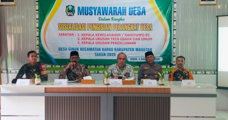 Magetan. - Babinsa Desa Ginuk Koramil 0804/07 Karangrejo, Kodim 0804/Magetan Serda Bambang mewakili Danramil Kapten Inf Kiswanto, S.E, menghadiri Musyawarah Desa Pengisian Perangkat Desa bertempat di aula Balai Desa Ginuk, Kecamatan Karas, Kabupaten Magetan. Jum'at (07/11/2025)